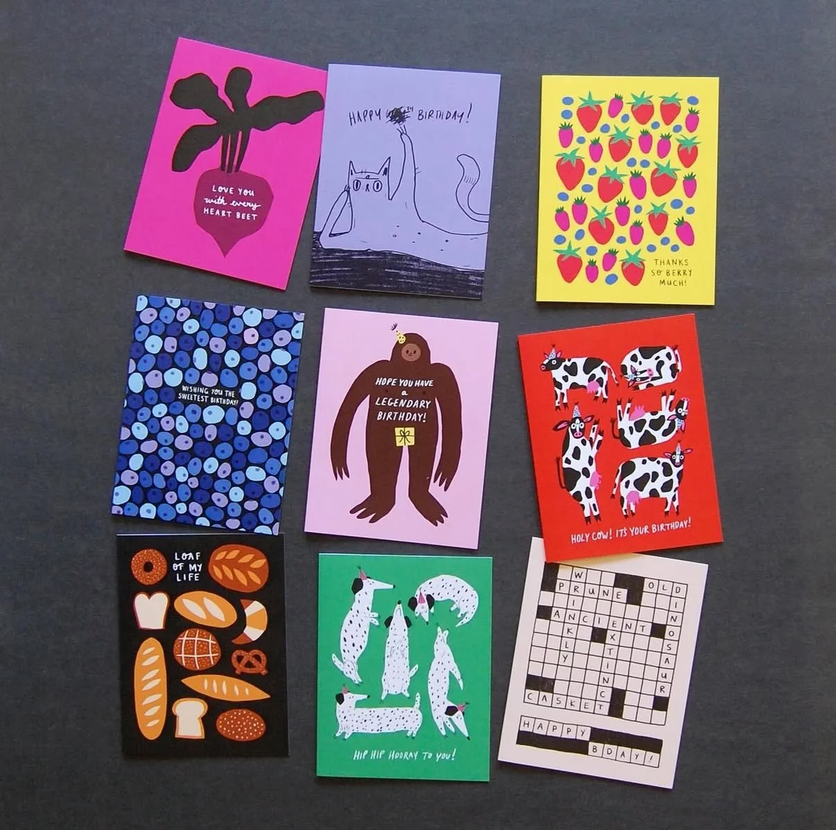 Printed by hand with friendly motifs and bright colors, this line pops on any card wall. Based in Washington State.